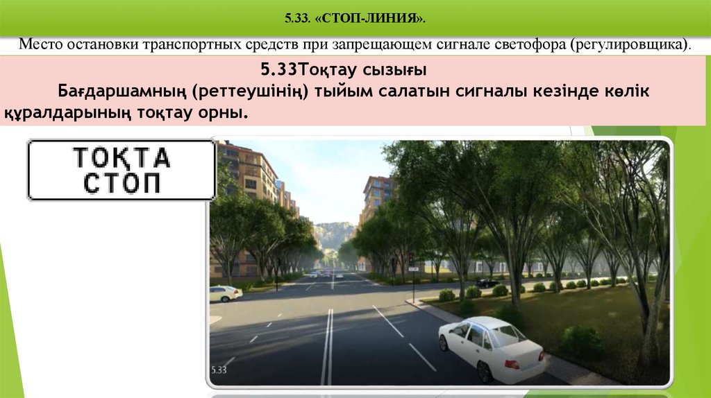 5.33. «СТОП-ЛИНИЯ».Место остановки транспортных средств при запрещающем сигнале светофора (регулировщика).