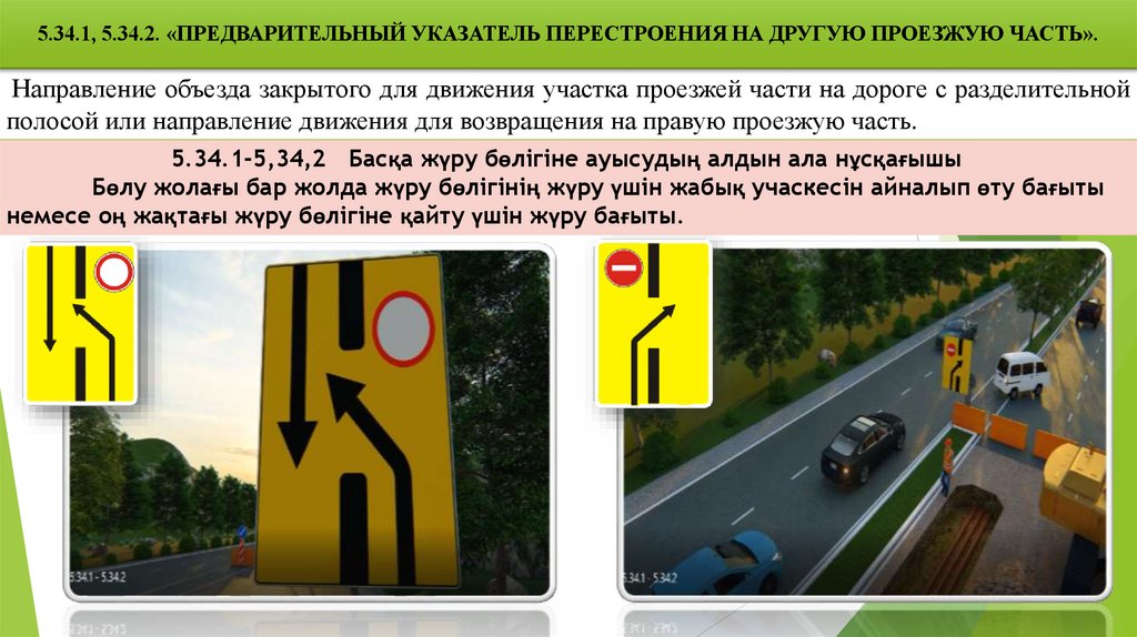 5.34.1, 5.34.2. «ПРЕДВАРИТЕЛЬНЫЙ УКАЗАТЕЛЬ ПЕРЕСТРОЕНИЯ НА ДРУГУЮ ПРОЕЗЖУЮ ЧАСТЬ».Направление объезда закрытого для движения участка проезжей части на дороге с разделительной