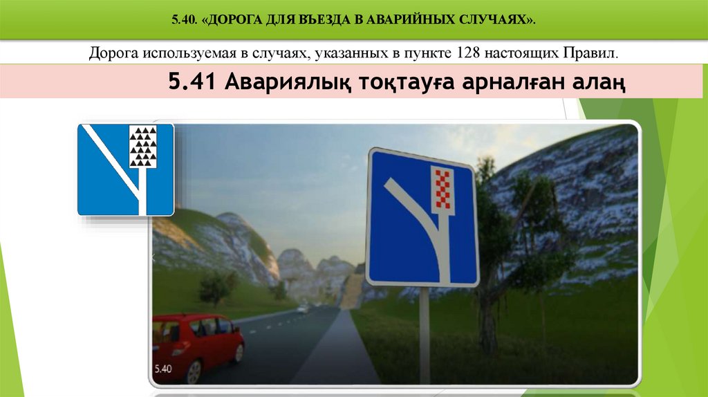 5.40. «ДОРОГА ДЛЯ ВЪЕЗДА В АВАРИЙНЫХ СЛУЧАЯХ».Дорога используемая в случаях, указанных в пункте 128 настоящих Правил.