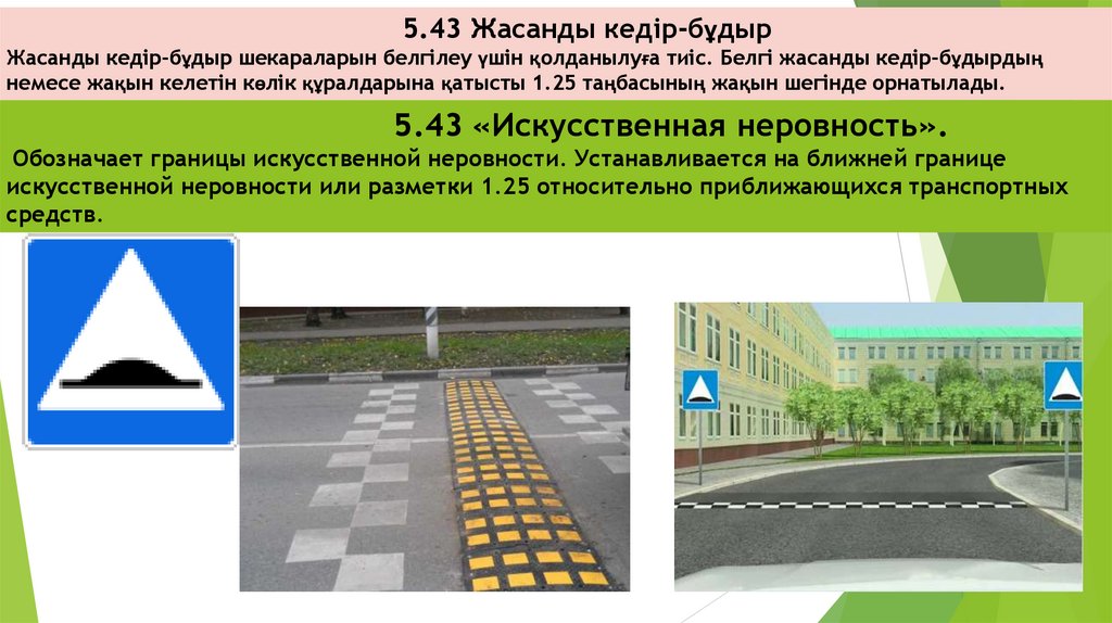 5.43 Жасанды кедір-бұдырЖасанды кедір-бұдыр шекараларын белгілеу үшін қолданылуға тиіс. Белгі жасанды кедір-бұдырдың