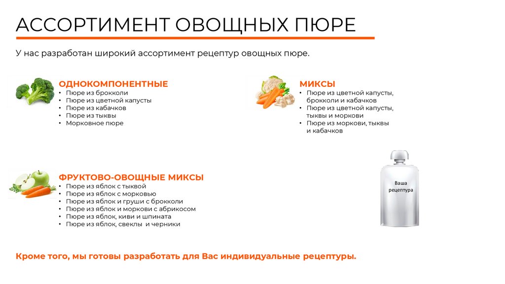 АССОРТИМЕНТ ОВОЩНЫХ ПЮРЕУ нас разработан широкий ассортимент рецептур овощных пюре.
