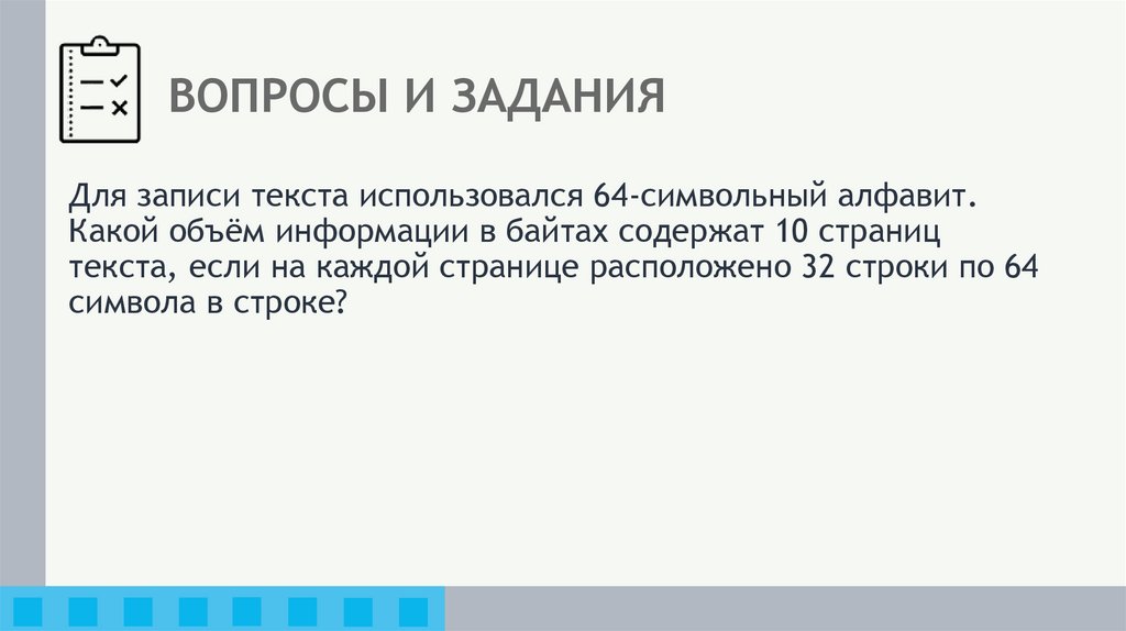 ВОПРОСЫ И ЗАДАНИЯДля записи текста использовался 64-символьный алфавит.