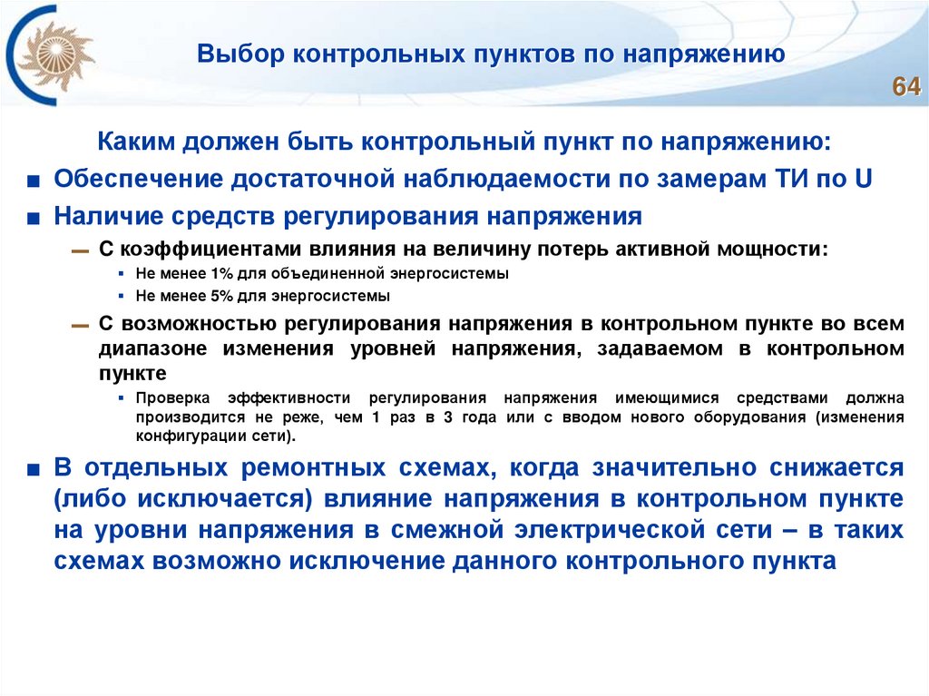 • На шинах объекта, влияющего на напряжение в контрольном пункте