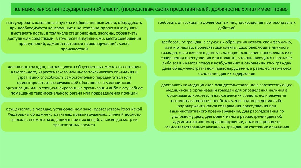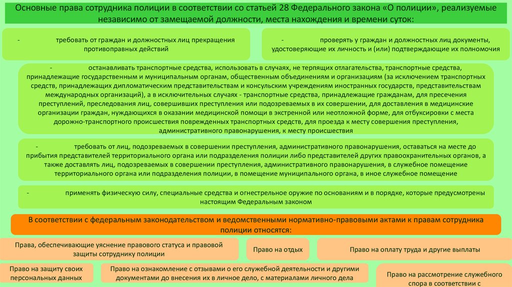 Основные права сотрудника полиции в соответствии со статьей 28 Федерального закона «О полиции», реализуемыенезависимо от замещаемой должности, места нахождения и времени суток: