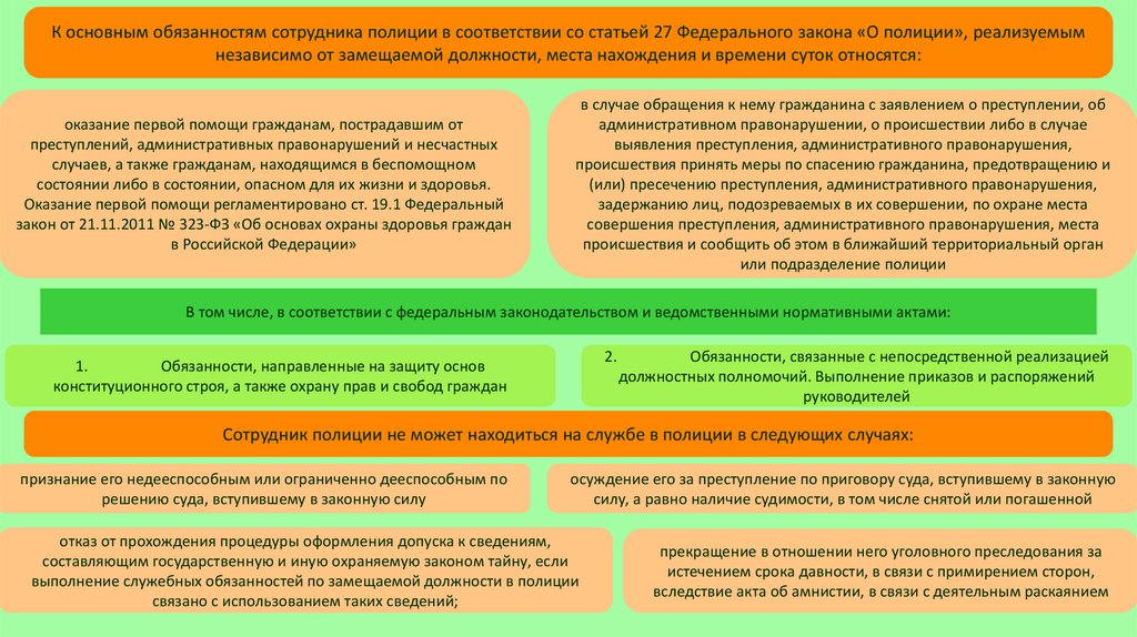 К основным обязанностям сотрудника полиции в соответствии со статьей 27 Федерального закона «О полиции», реализуемымнезависимо от замещаемой должности, места нахождения и времени суток относятся: