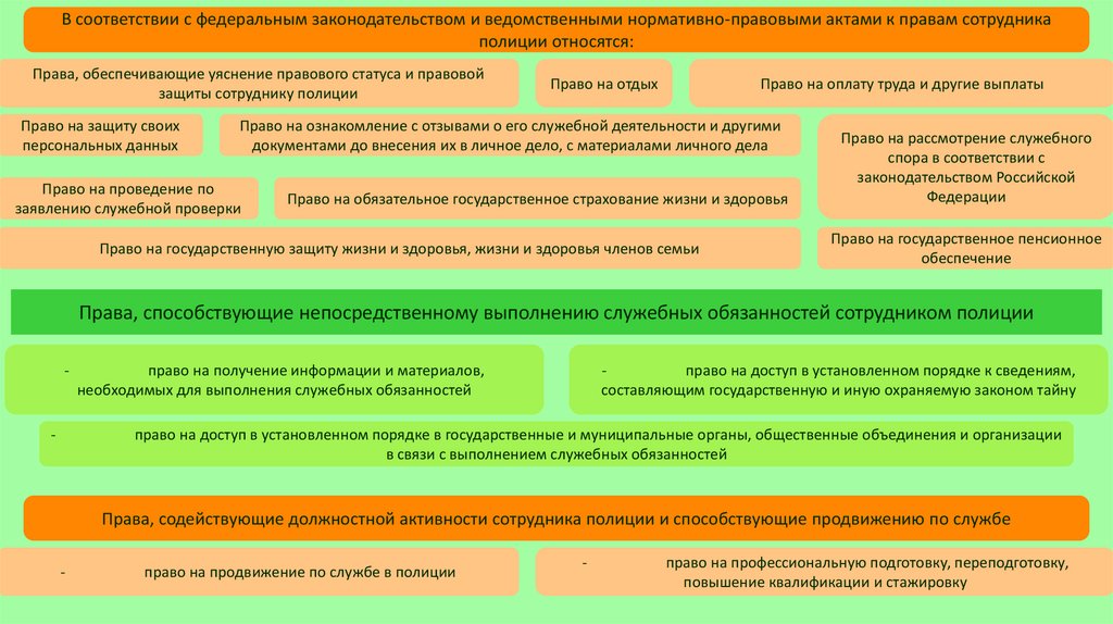 В соответствии с федеральным законодательством и ведомственными нормативно-правовыми актами к правам сотрудникаполиции относятся: