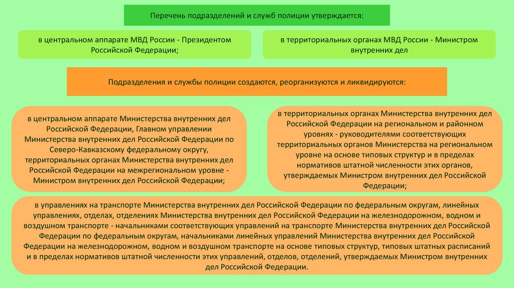 Перечень подразделений и служб полиции утверждается:в центральном аппарате МВД России - Президентом