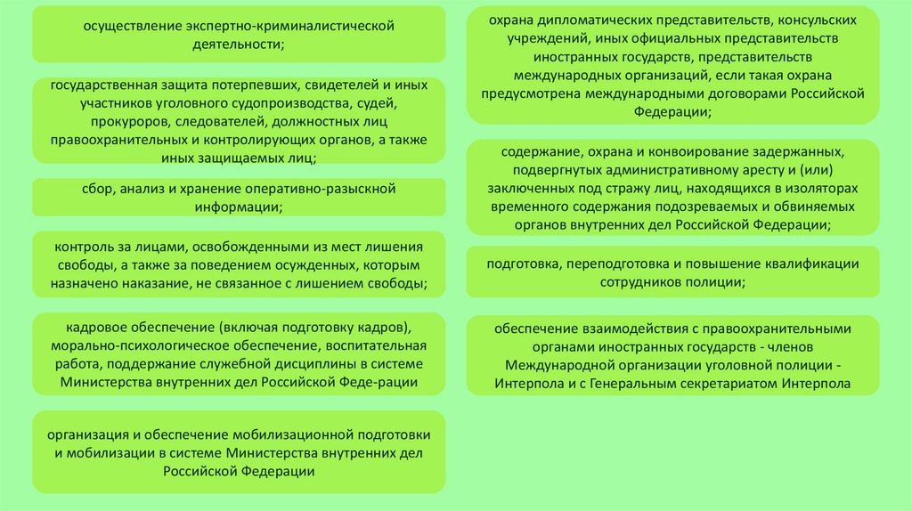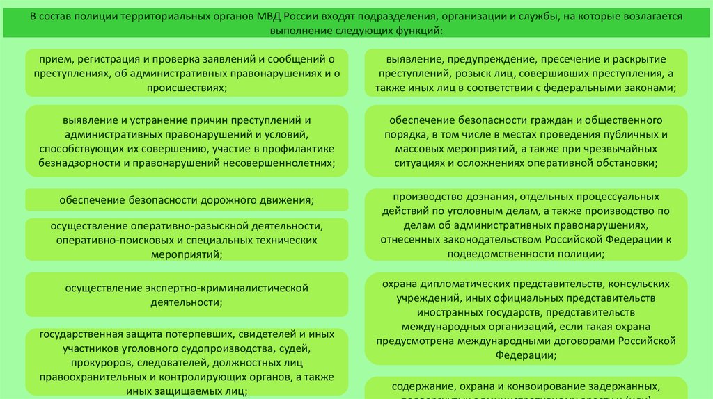 В состав полиции территориальных органов МВД России входят подразделения, организации и службы, на которые возлагаетсявыполнение следующих функций: