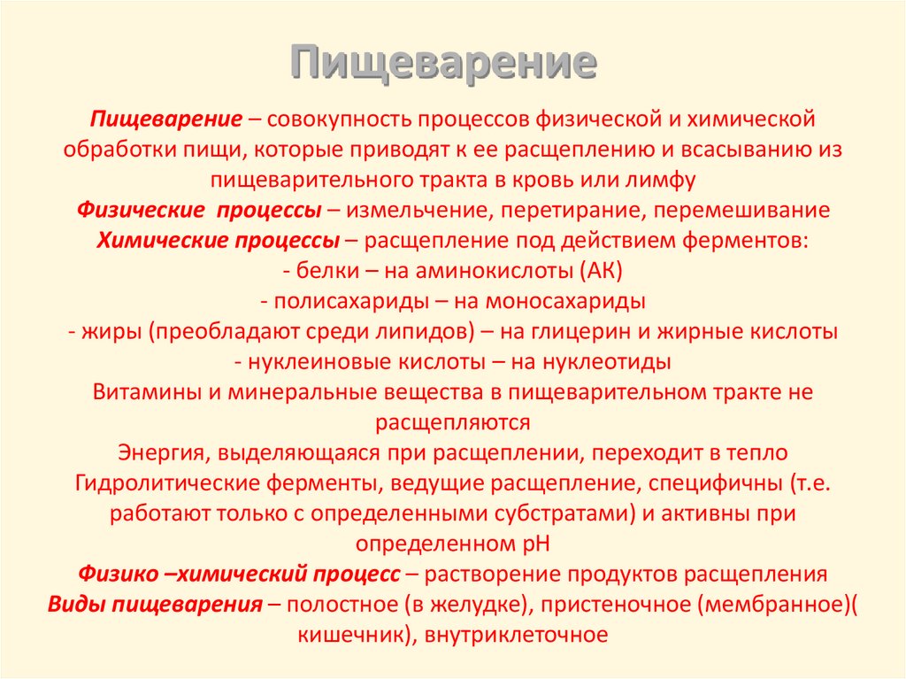 Пищеварение – совокупность процессов физической и химическойобработки пищи, которые приводят к ее расщеплению и всасыванию из