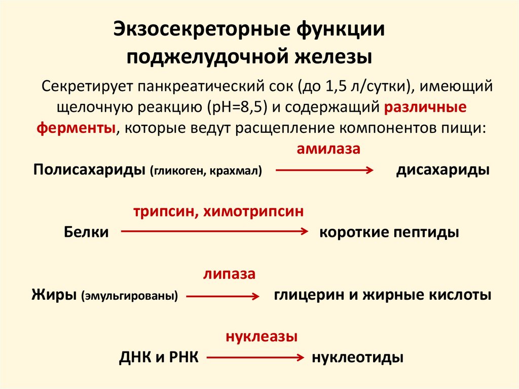 Секретирует панкреатический сок (до 1,5 л/сутки), имеющий