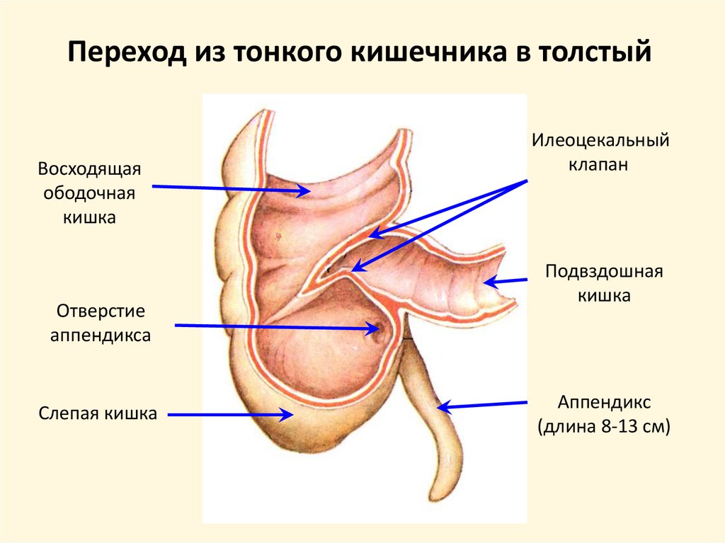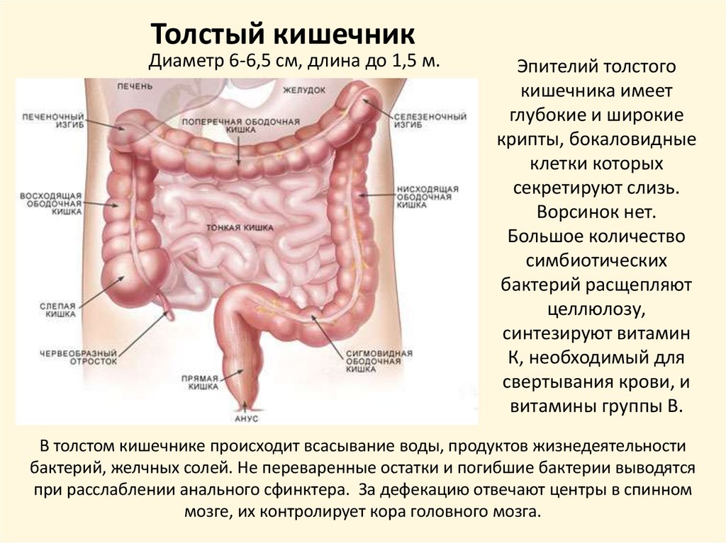 В толстом кишечнике происходит всасывание воды, продуктов жизнедеятельности