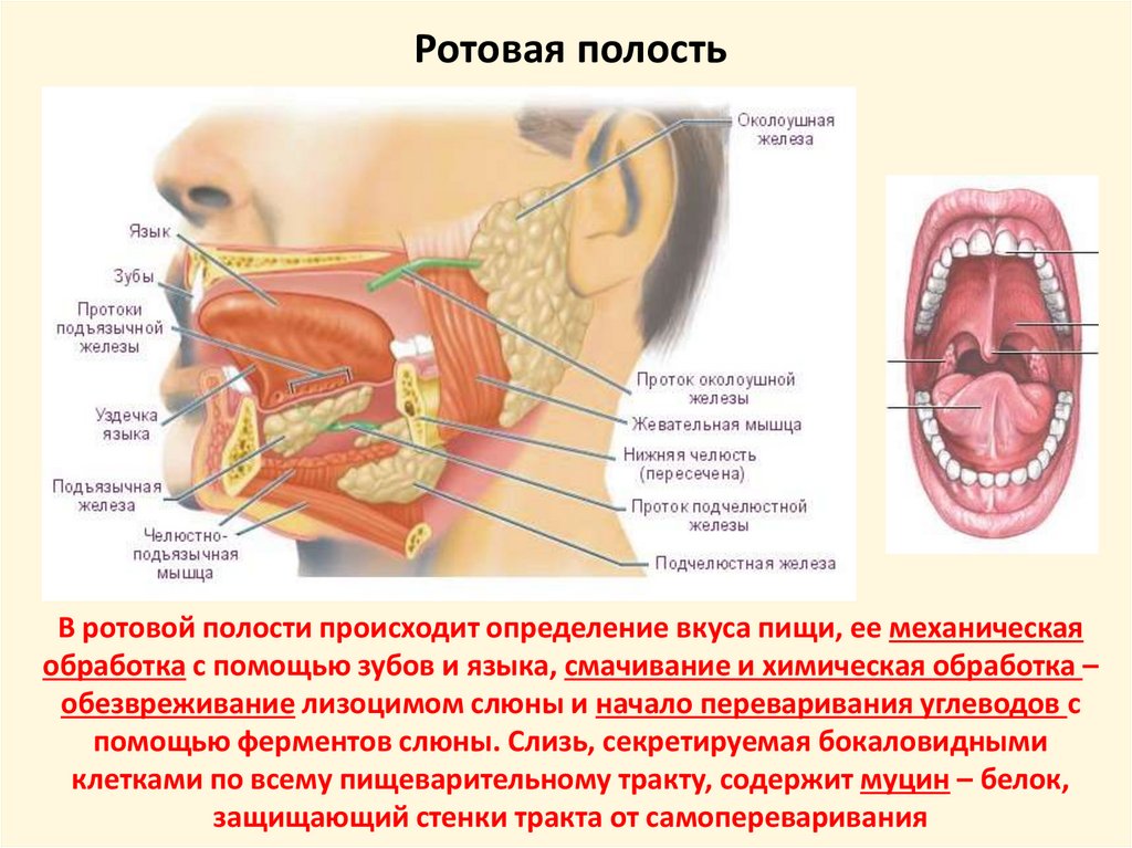 Ротовая полостьВ ротовой полости происходит определение вкуса пищи, ее механическая