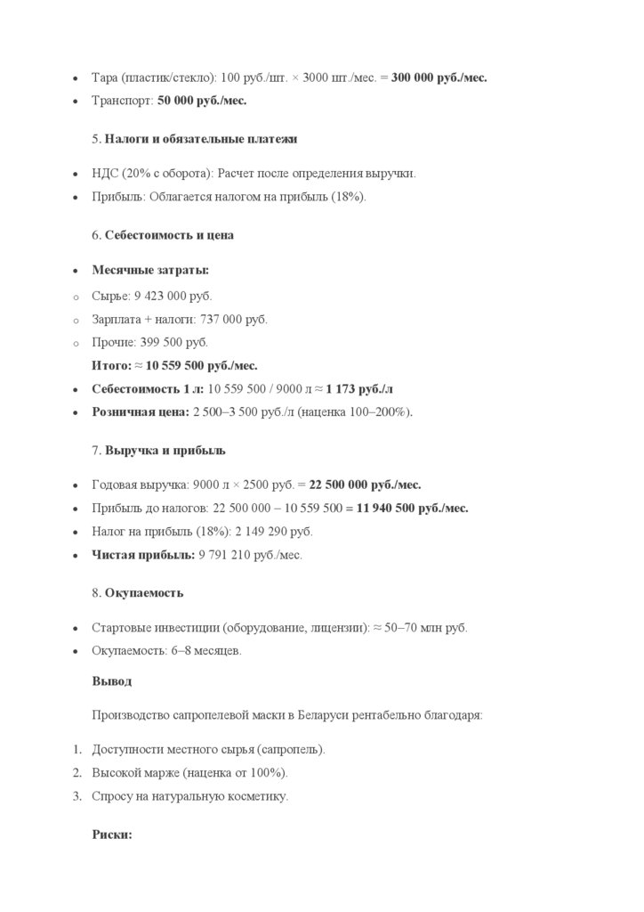 Тара (пластик/стекло): 100 руб./шт. × 3000 шт./мес. = 300 000 руб./мес.Транспорт: 50 000 руб./мес.