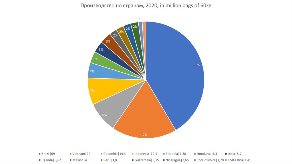 Производство по странам, 2020, in million bags of 60kg1% 1%