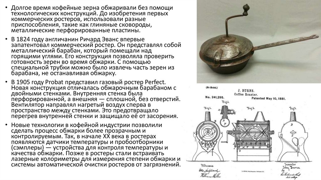 • Долгое время кофейные зерна обжаривали без помощитехнологических конструкций. До изобретения первых