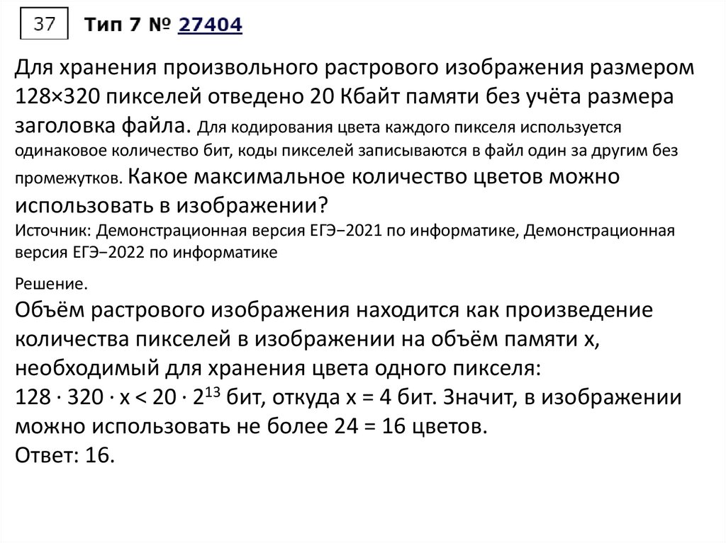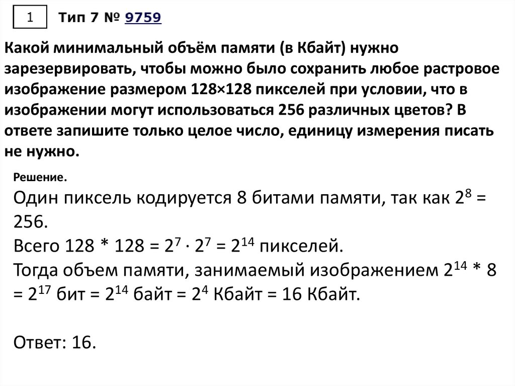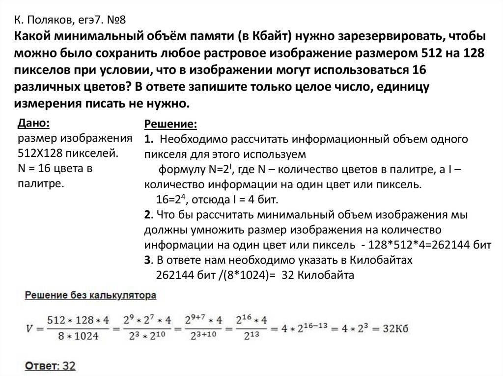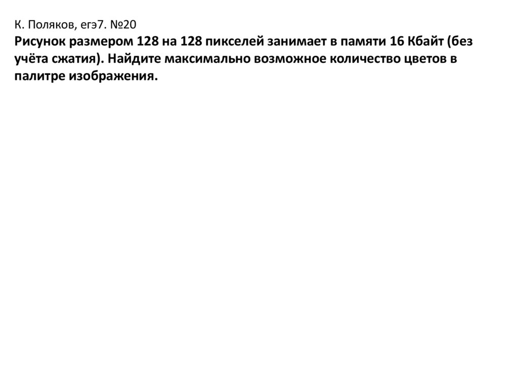 К. Поляков, егэ7. №20Рисунок размером 128 на 128 пикселей занимает в памяти 16 Кбайт (без