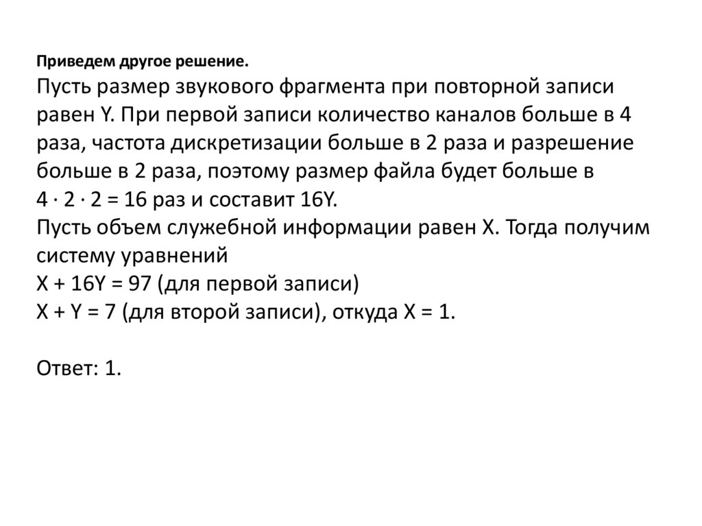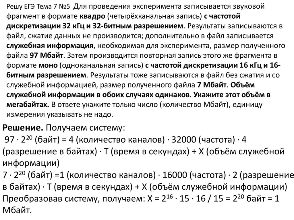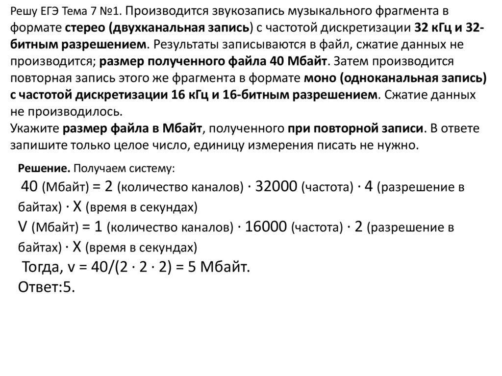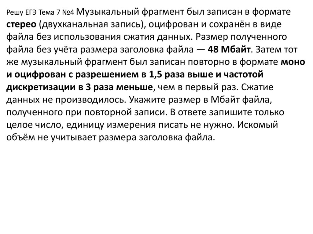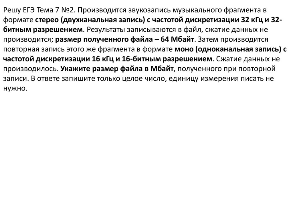 Решу ЕГЭ Тема 7 №2. Производится звукозапись музыкального фрагмента вформате стерео (двухканальная запись) с частотой дискретизации 32 кГц и 32битным разрешением. Результаты записываются в файл, сжатие данных не