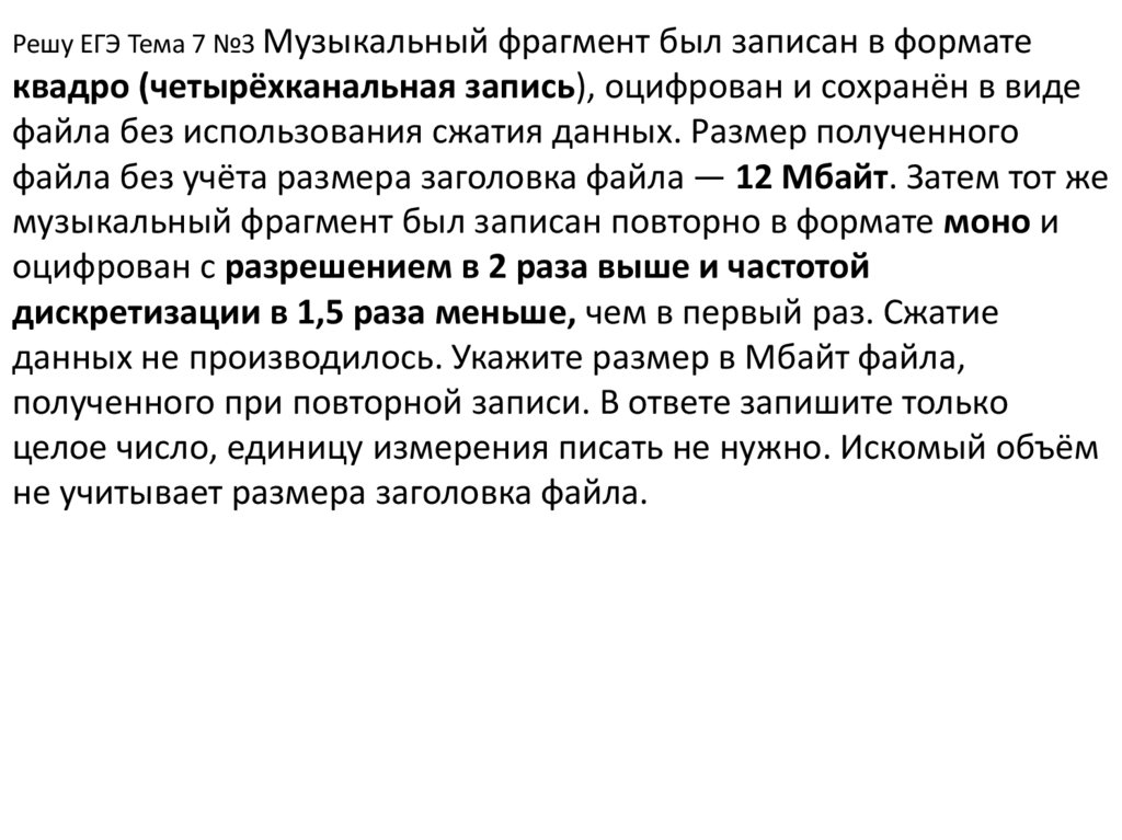 Решу ЕГЭ Тема 7 №3 Музыкальный фрагмент был записан в форматеквадро (четырёхканальная запись), оцифрован и сохранён в виде