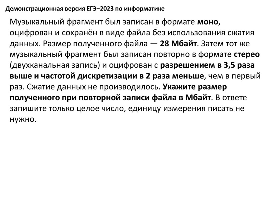 Демонстрационная версия ЕГЭ−2023 по информатикеМузыкальный фрагмент был записан в формате моно,