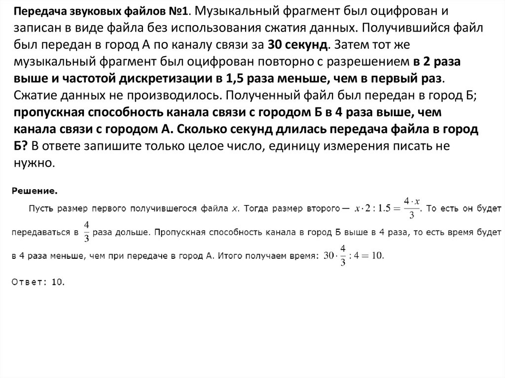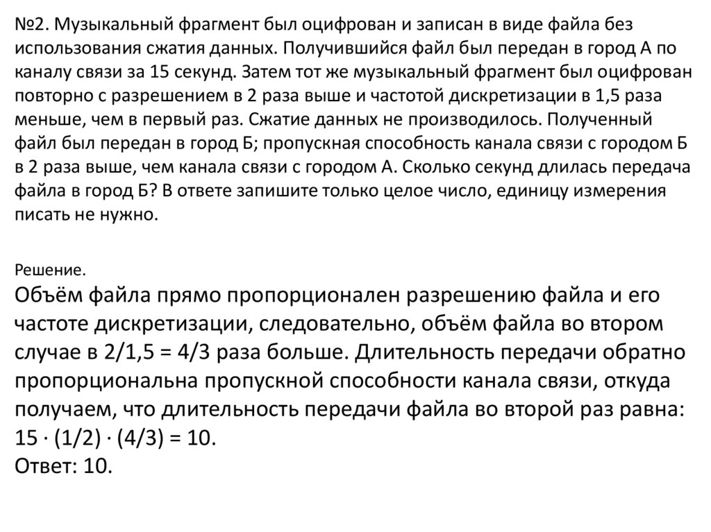 №2. Музыкальный фрагмент был оцифрован и записан в виде файла безиспользования сжатия данных. Получившийся файл был передан в город А по