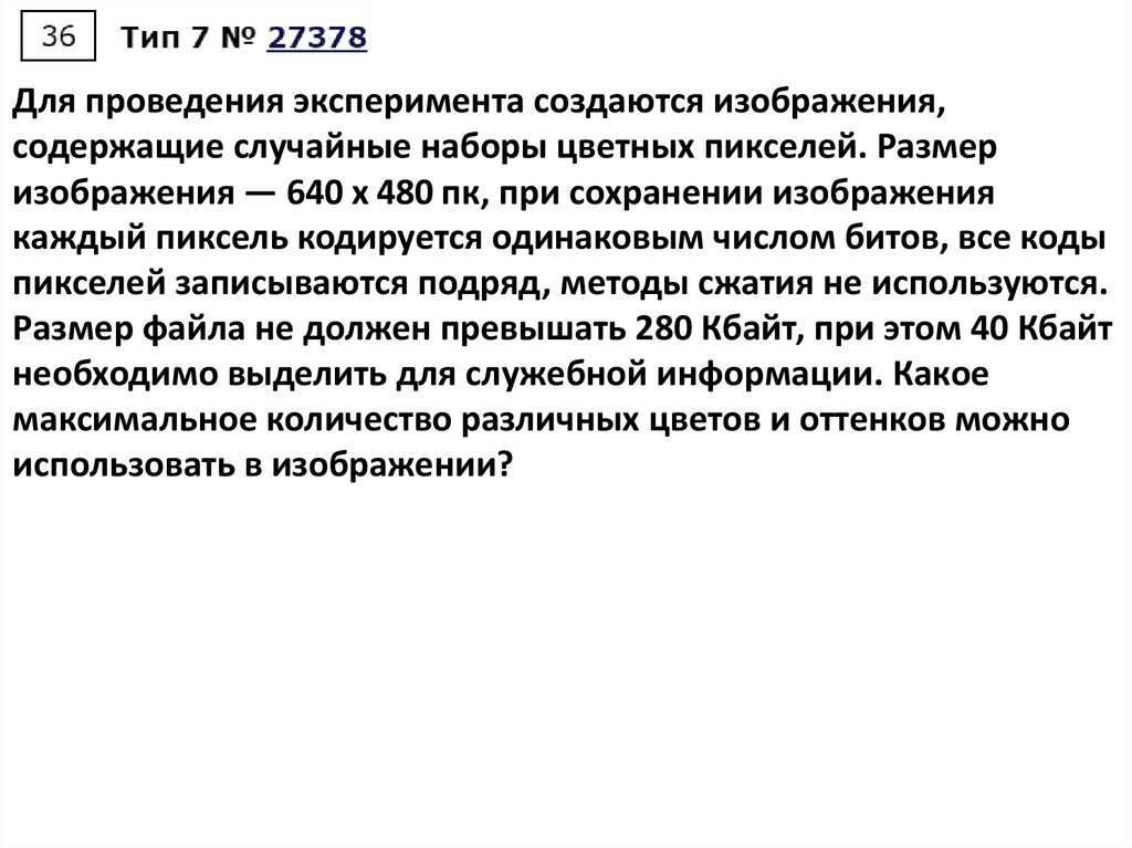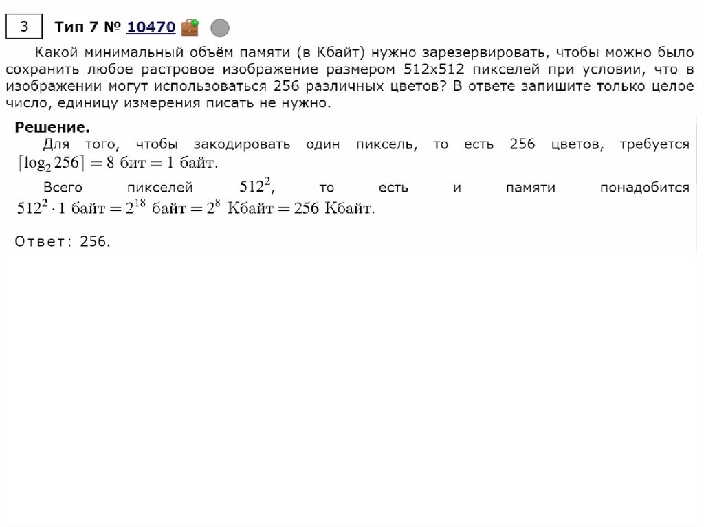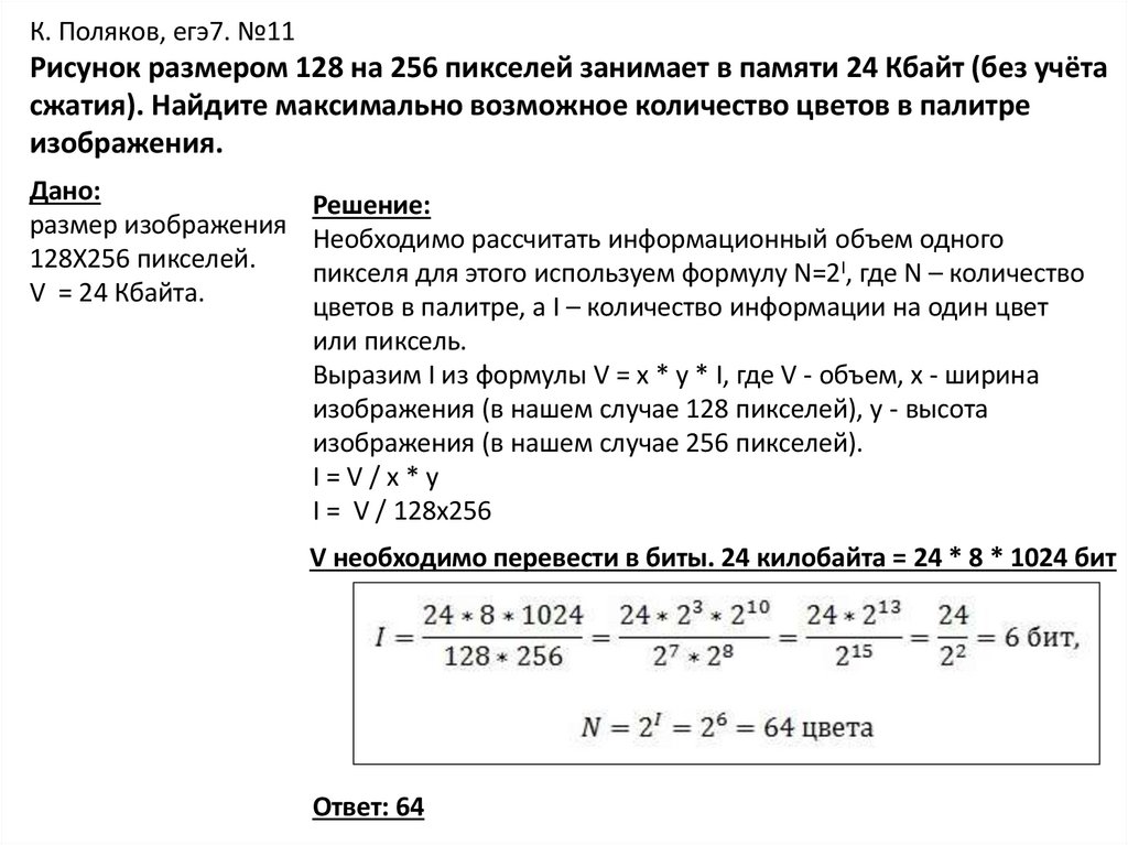 К. Поляков, егэ7. №11Рисунок размером 128 на 256 пикселей занимает в памяти 24 Кбайт (без учёта