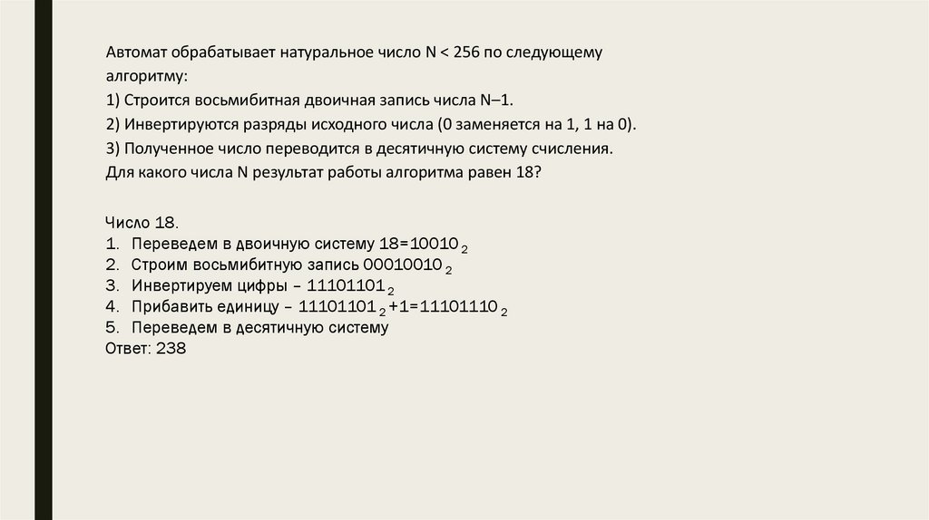 Автомат обрабатывает целое число N (0 ≤ N ≤ 255) по следующему алгоритму:1) Строится восьмибитная двоичная запись числа N.