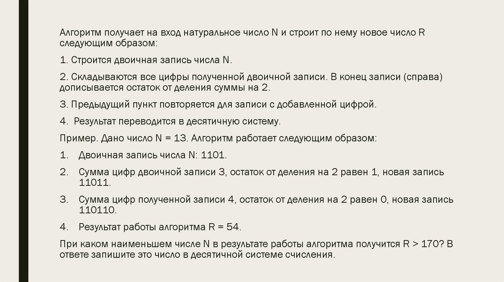 На вход алгоритма подаётся натуральное число N. Алгоритм строит по нему новое число Rследующим образом.