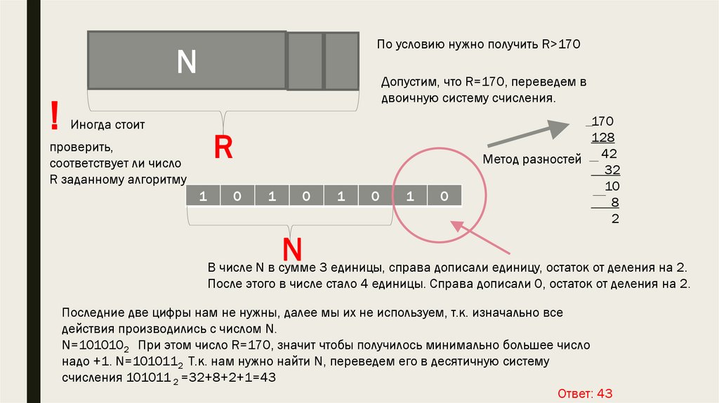исходного числа N) является двоичной записью искомого числа R. Укажите