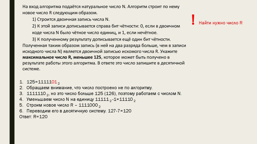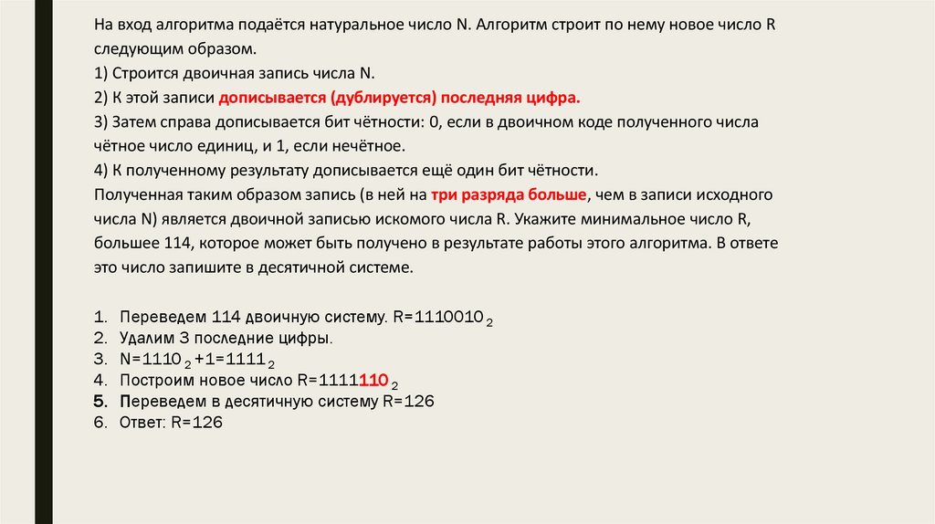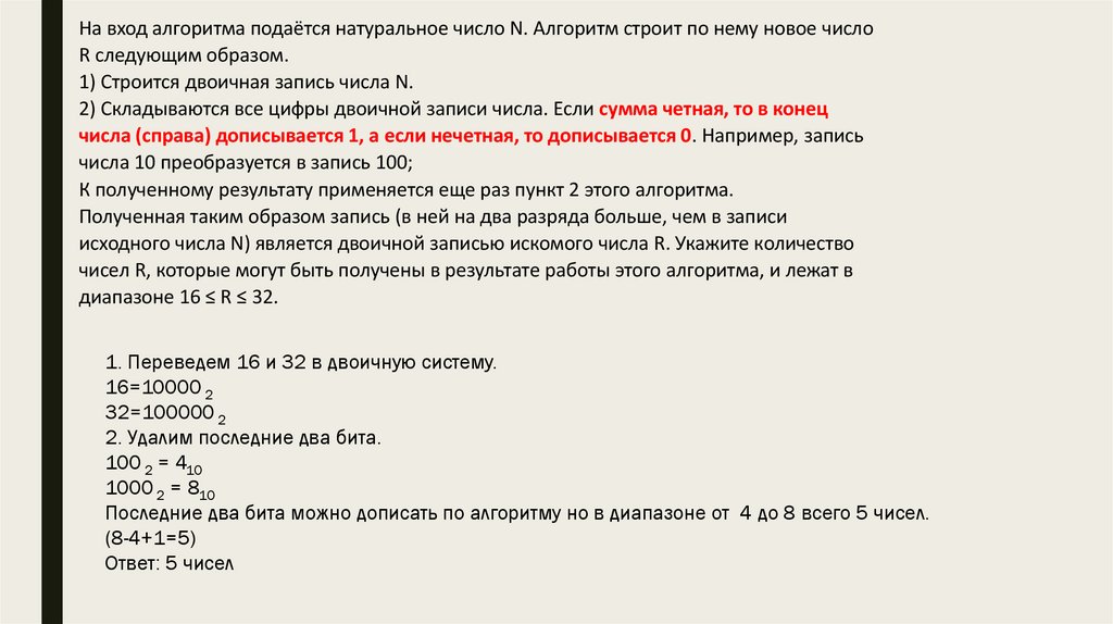 На вход алгоритма подаётся натуральное число N. Алгоритм строит по немуновое число R следующим образом.