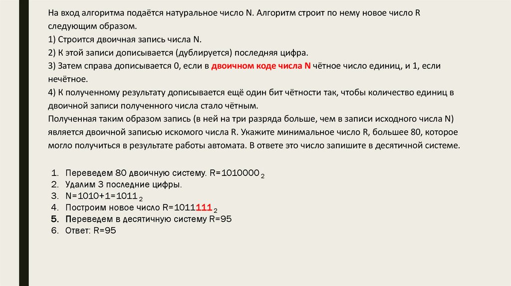 является двоичной записью искомого числа R. Укажите минимальное число R, большее 80, которое