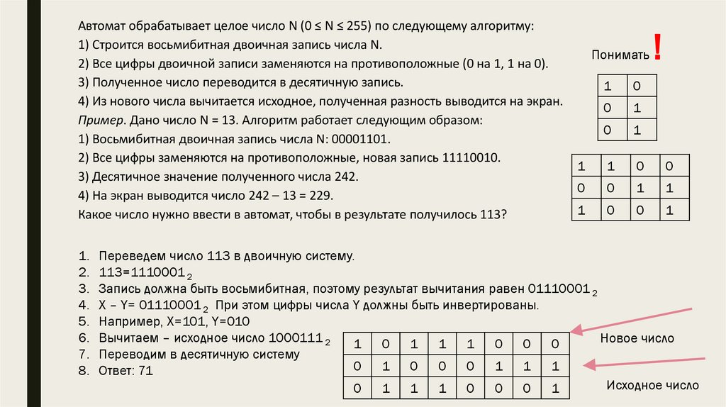 4. Х – Y= 01110001 2 При этом цифры числа Y должны быть инвертированы.
