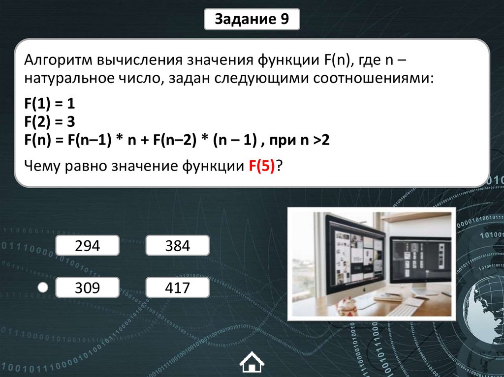 Задание 9Алгоритм вычисления значения функции F(n), где n –