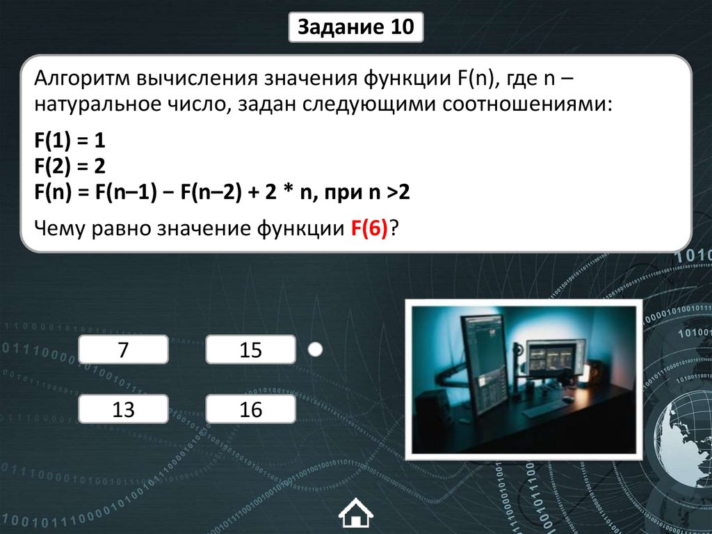 Задание 10Алгоритм вычисления значения функции F(n), где n –