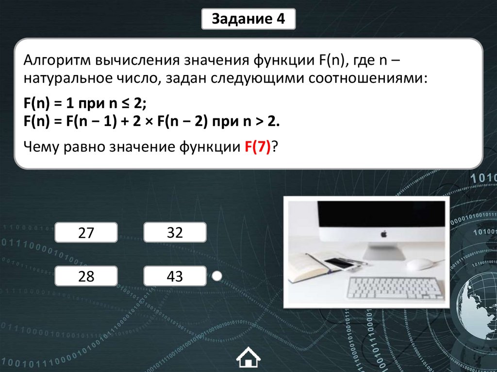 Задание 4Алгоритм вычисления значения функции F(n), где n –