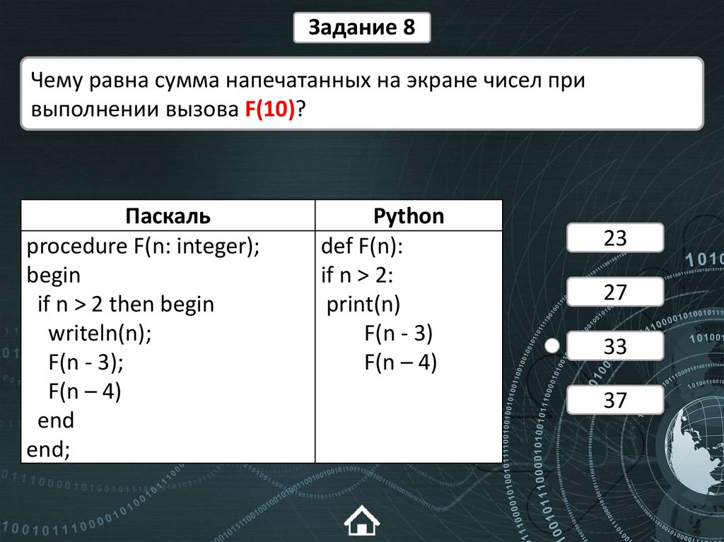 Задание 8Чему равна сумма напечатанных на экране чисел при