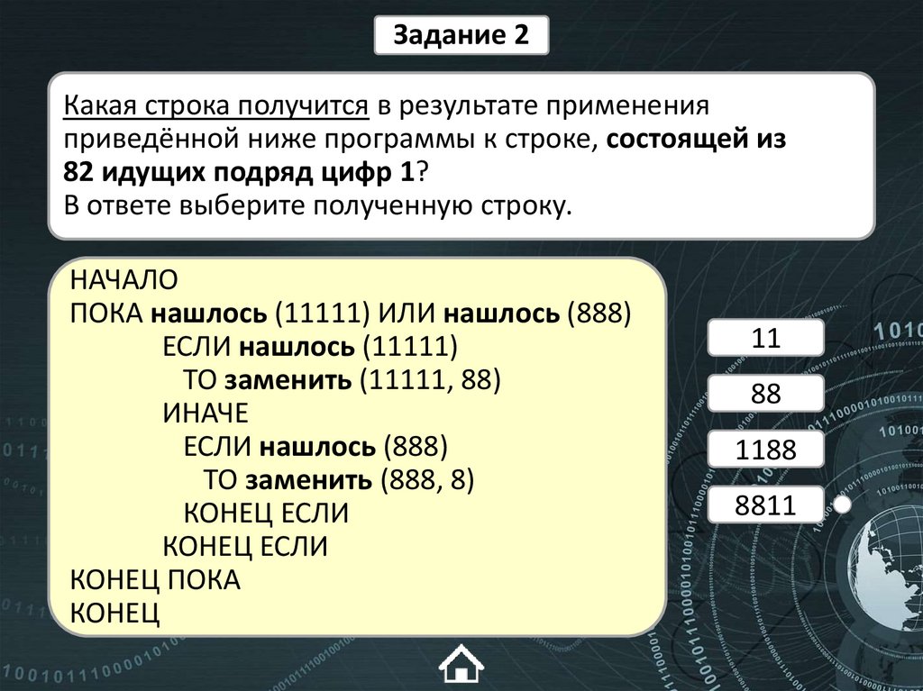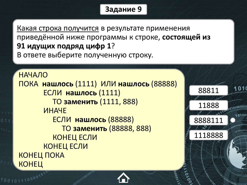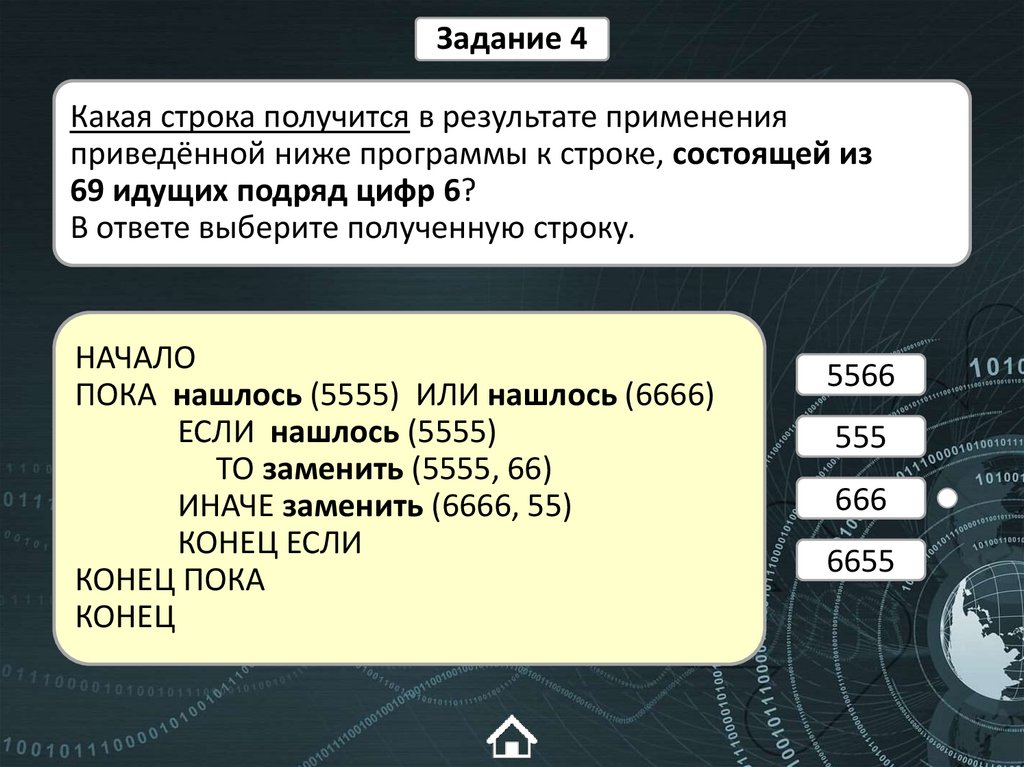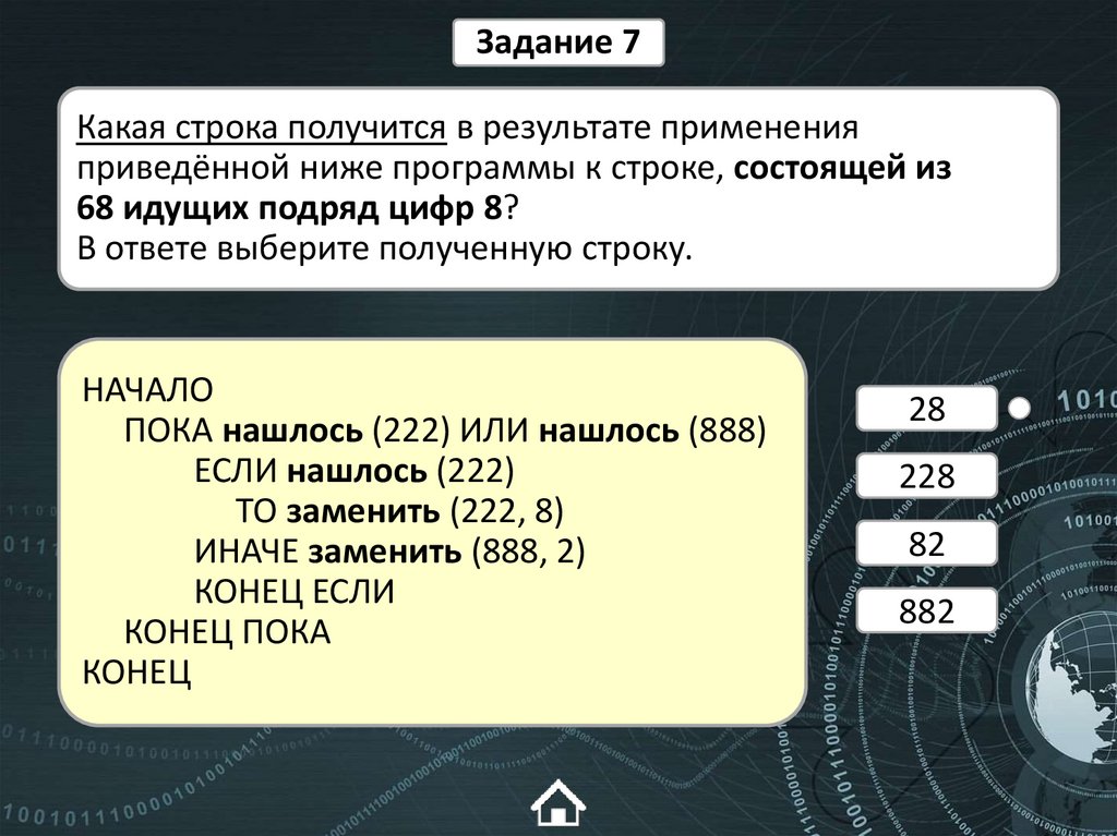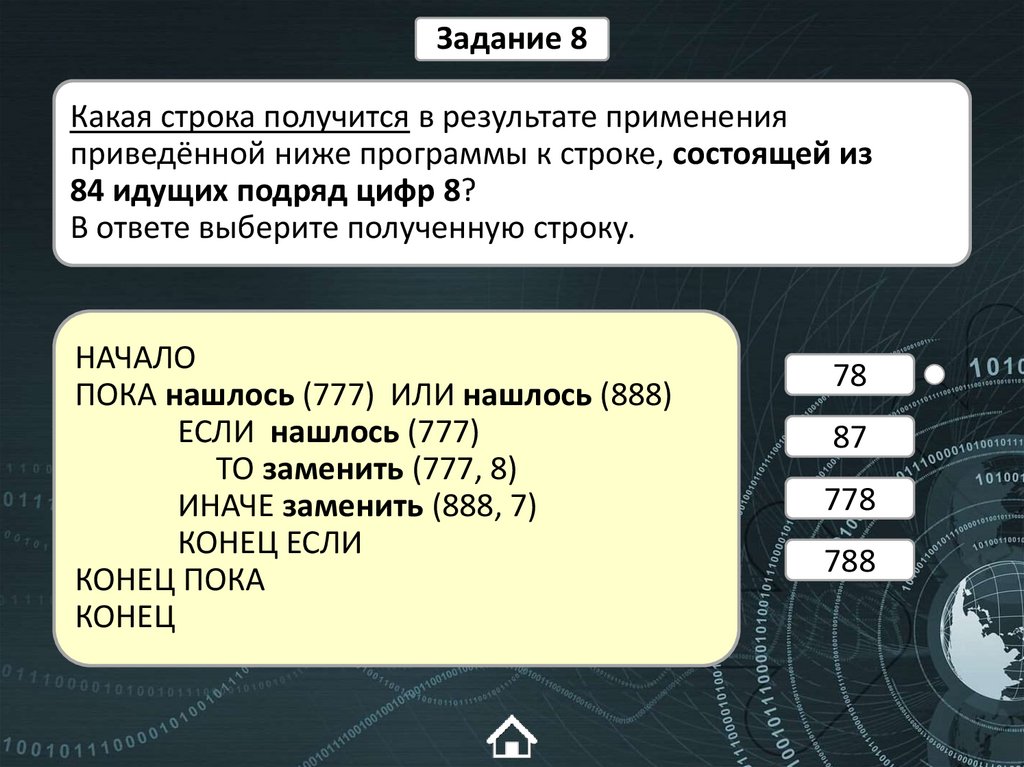 4. Какая строка получится в результате применения приведённой ниже программы к строке, состоящей из 70 идущих подряд цифр 8? В