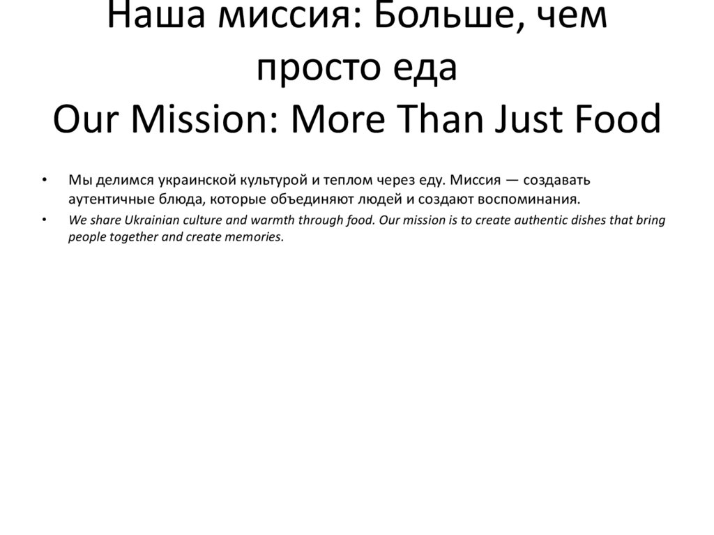 We share Ukrainian culture and warmth through food. Our mission is to create authentic dishes that bring