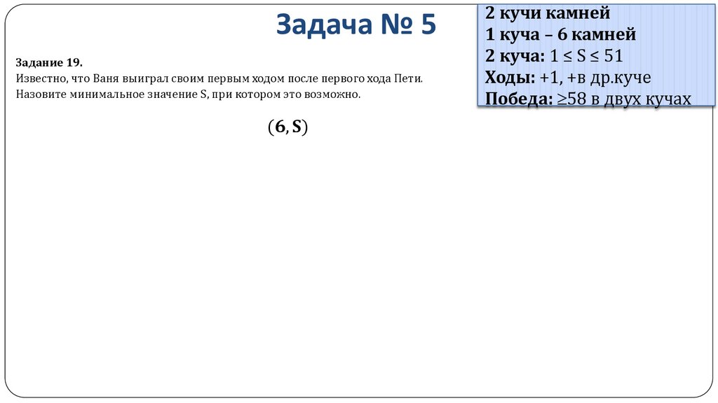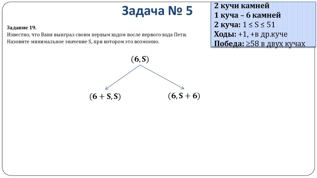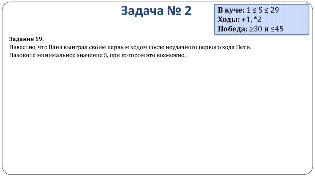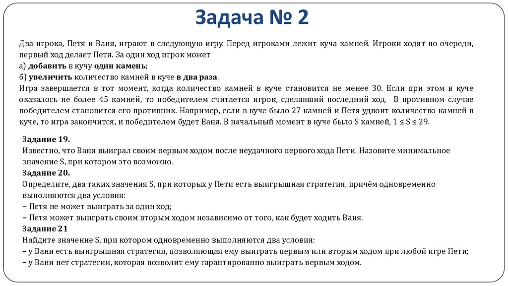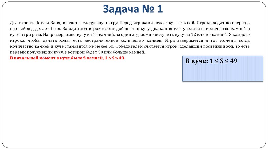 Задача № 1Два игрока, Петя и Ваня, играют в следующую игру. Перед игроками лежит куча камней. Игроки ходят по очереди,