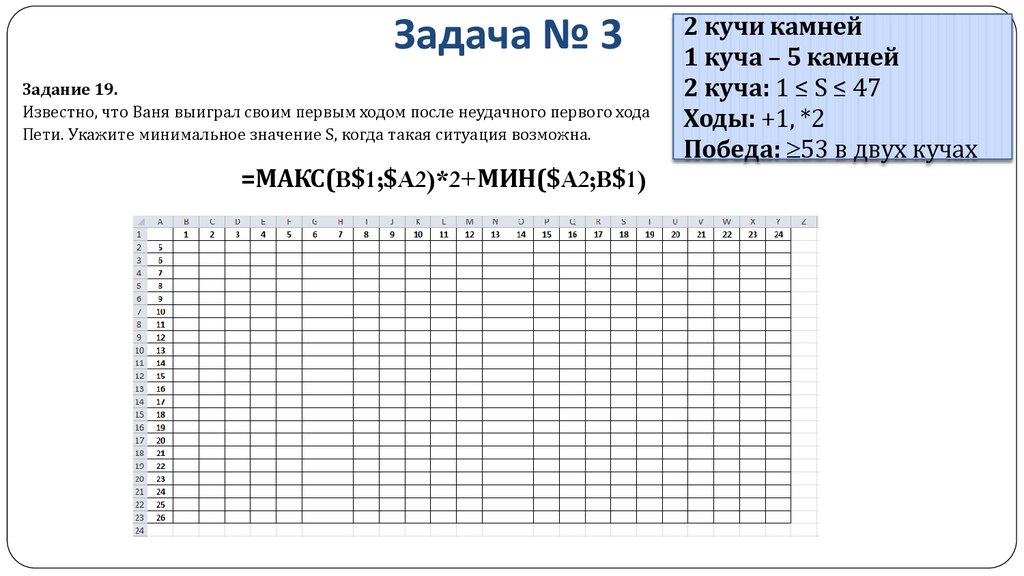куче в три раза. Например, имея кучу из 10 камней, за один ход можно получить кучу из 12 или 30 камней. У
