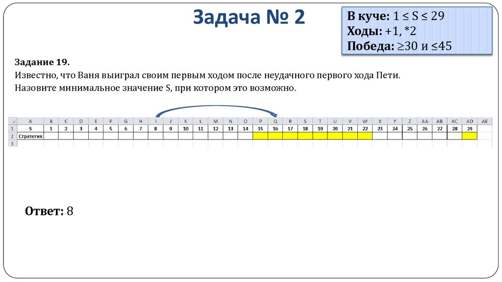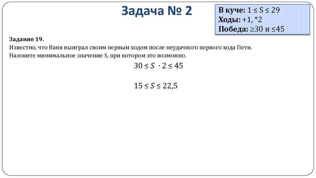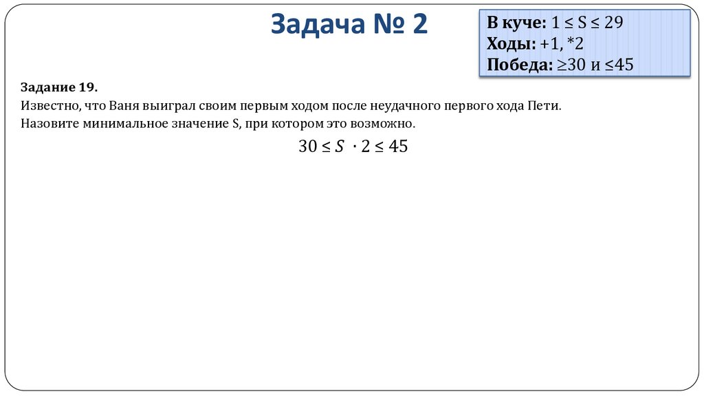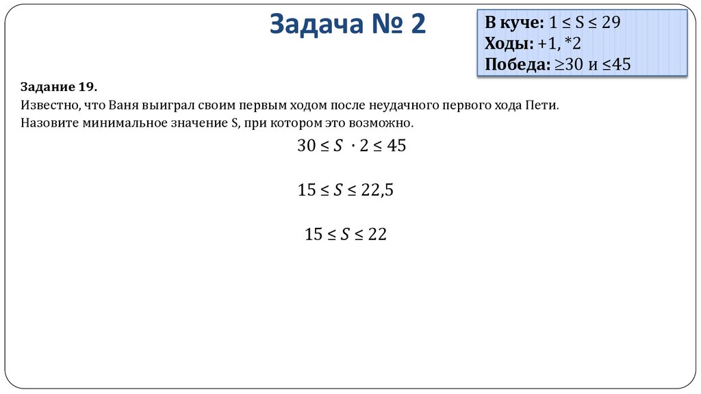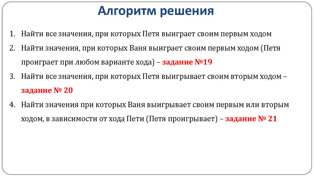 Алгоритм решения1. Найти все значения, при которых Петя выиграет своим первым ходом
