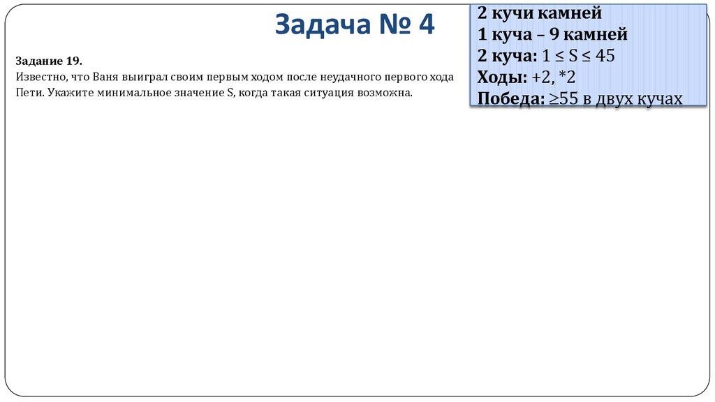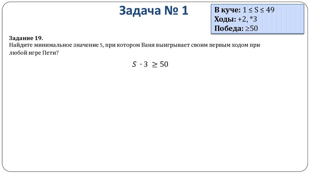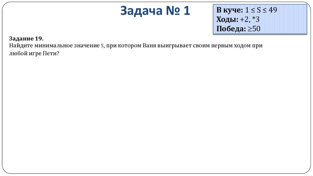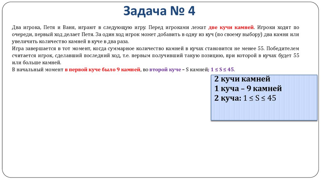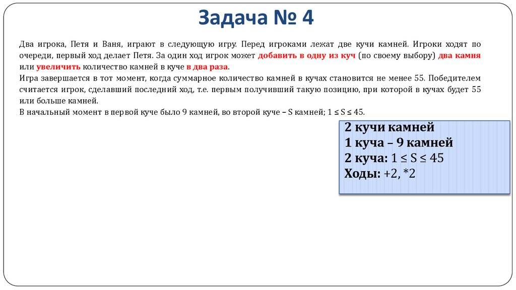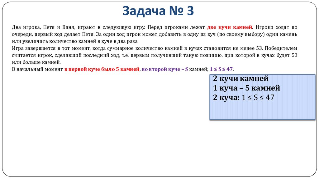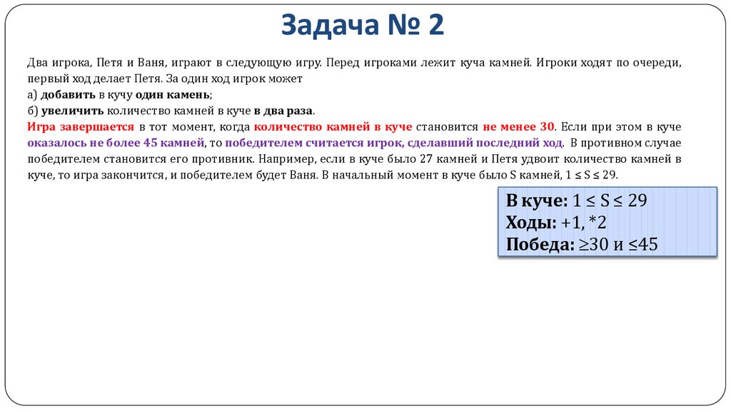Задача № 1Два игрока, Петя и Ваня, играют в следующую игру. Перед игроками лежит куча камней. Игроки ходят по очереди,