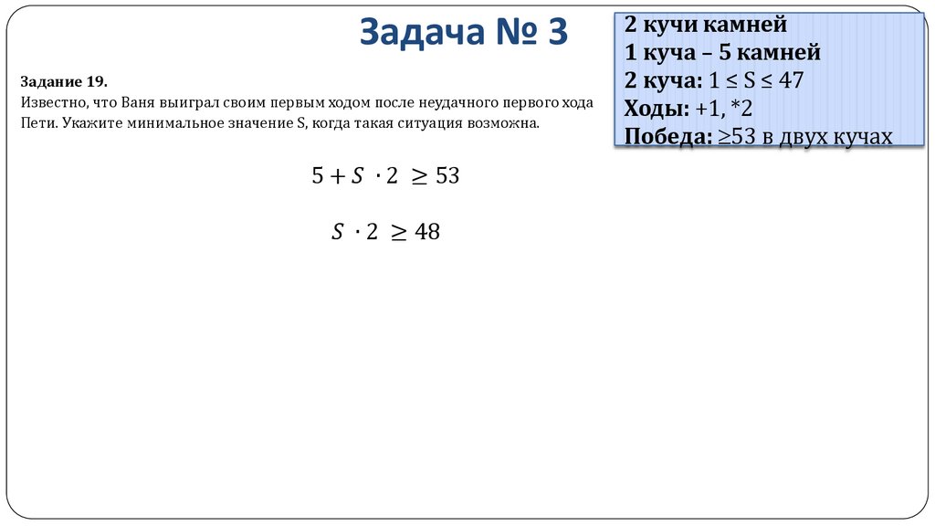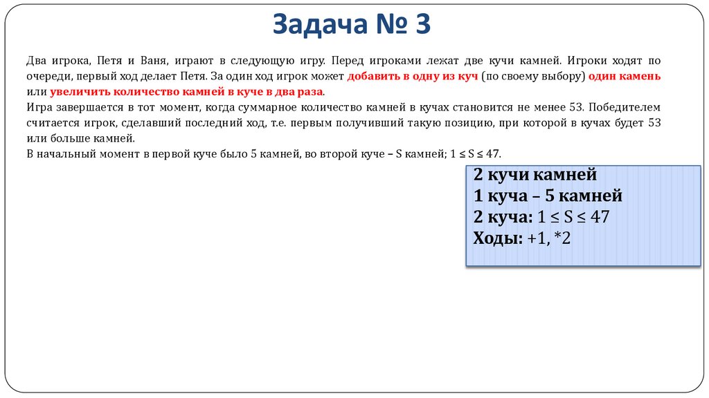 куче в три раза. Например, имея кучу из 10 камней, за один ход можно получить кучу из 12 или 30 камней. У