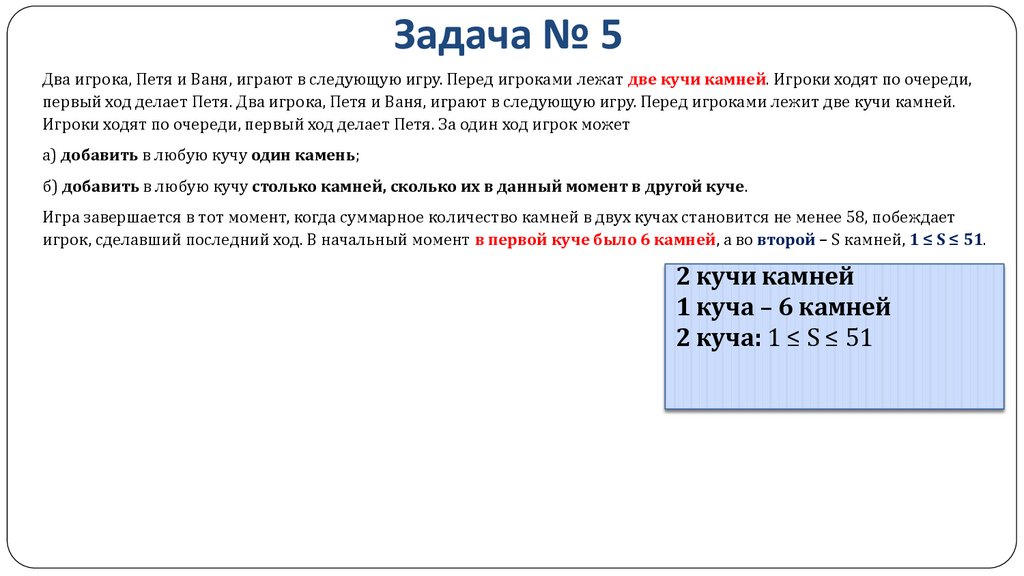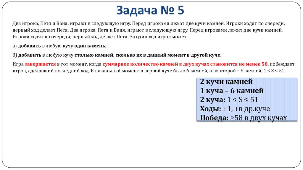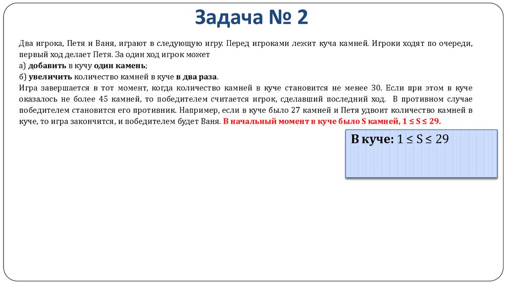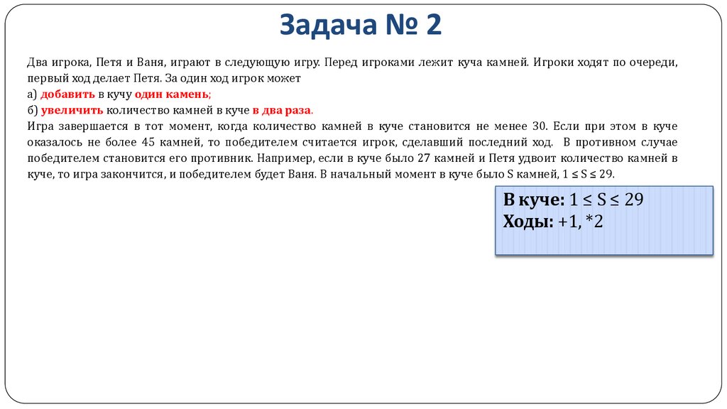 куче в три раза. Например, имея кучу из 10 камней, за один ход можно получить кучу из 12 или 30 камней. У