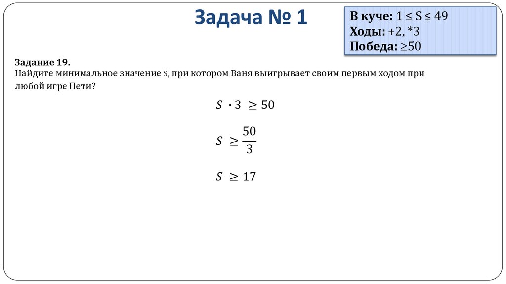 Найдите минимальное значение S, при котором Ваня выигрывает своим первым ходом при любой игре Пети?
