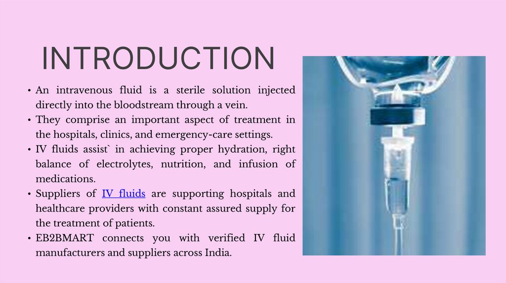 INTRODUCTION• An intravenous fluid is a sterile solution injected