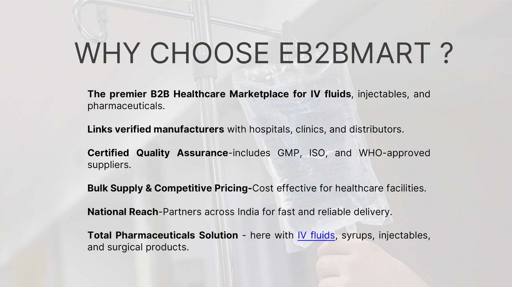 WHY CHOOSE EB2BMART ?The premier B2B Healthcare Marketplace for IV fluids, injectables, and