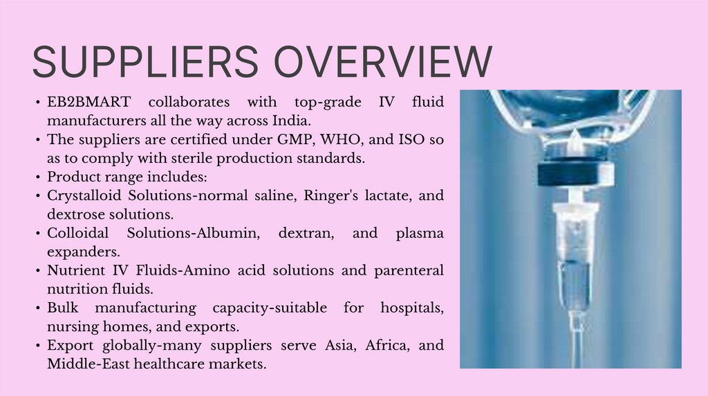 SUPPLIERS OVERVIEW• EB2BMART collaborates with top-grade IV fluid