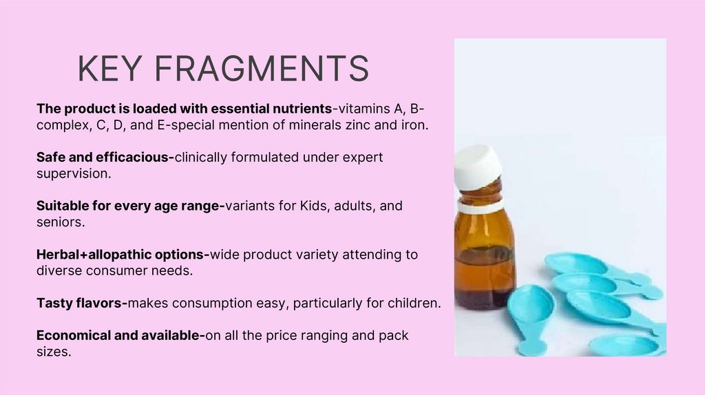 KEY FRAGMENTSThe product is loaded with essential nutrients-vitamins A, Bcomplex, C, D, and E-special mention of minerals zinc and iron.