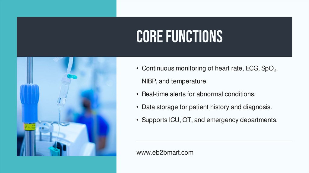 CORE FUNCTIONS• Continuous monitoring of heart rate, ECG, SpO