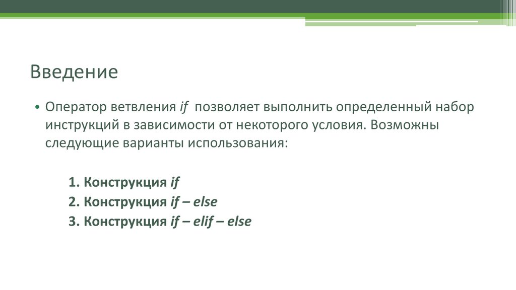 Введение• Оператор ветвления if позволяет выполнить определенный набор
